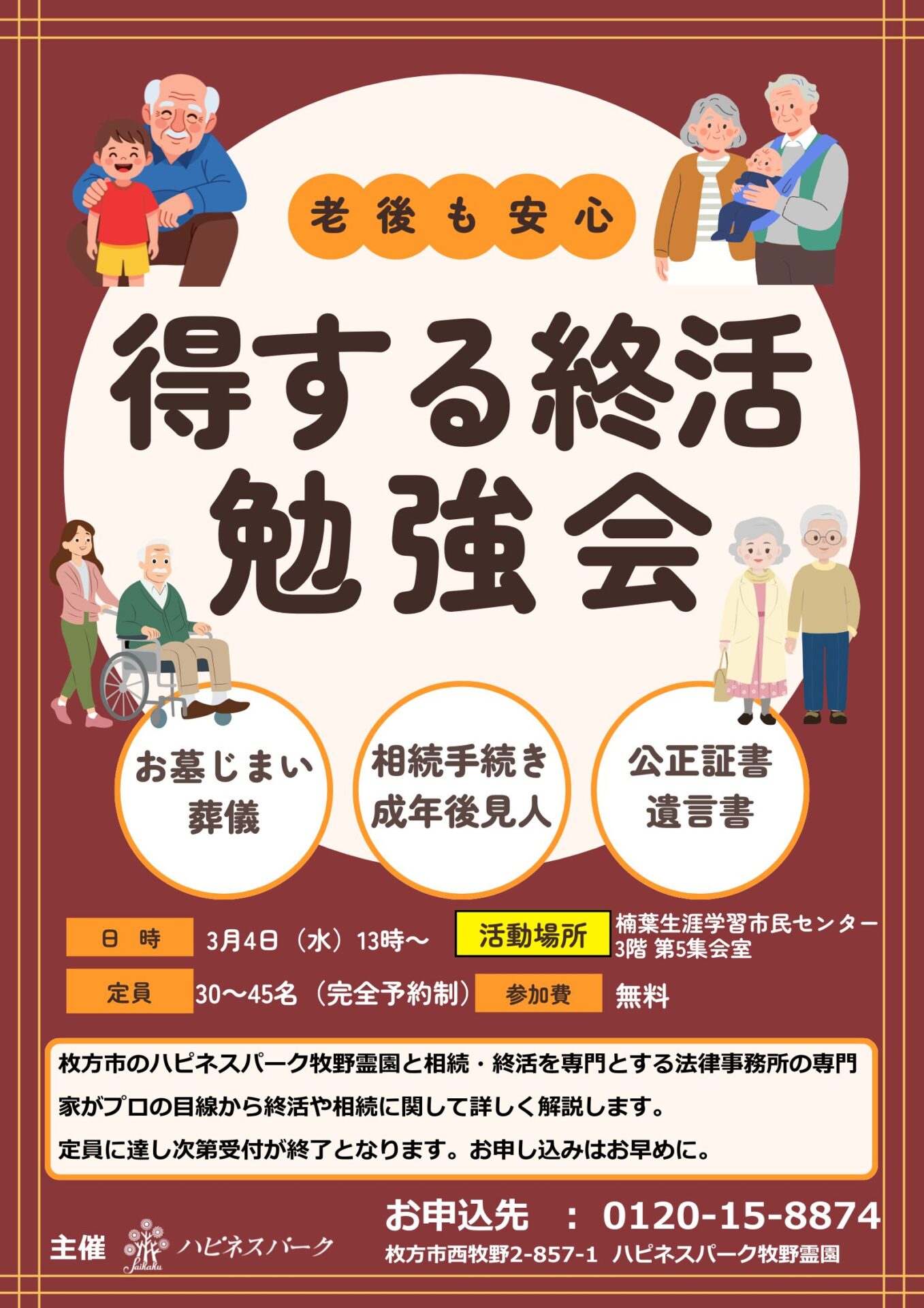 楠葉生涯学習市民センターの3階第5集会室で「終活」に関する勉強会を開催します。