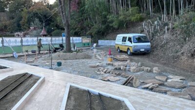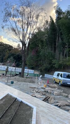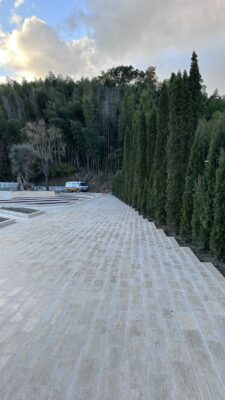 新区画の一番奥に配置された巨大な柳の周囲に新たな形を創る!とてもお洒落でお墓参りに来るたびに英国式の石積みに喜んでもらえることだろう!これから開発する様々な場に創らせていただきたい!ここにも3年~4年で生い茂る柳を囲み、皆で先祖回忌をしていただきたい。