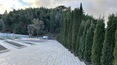 千年オリーブの森のヒバの壁が完成し、3年~4年で10メートルほどの高さになる。そして霊園内が隣地から見えなくなる!緑地で囲まれた聖域はとても美しく、来園されるお客様にとっても癒しの空間に違いない!