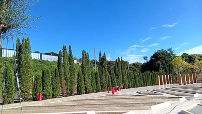 境界にヒバを植樹し、どんどん様相が変わって来た!ずっーと眺めていたら、何と素晴らしい景色だと感じた!ここまできたら細部の植樹と部材をどんどん置いていくと更に美しくなる!年明けからオープンしたいので、皆さまには楽しみにしていてもらいたい。