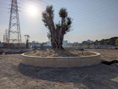 昨日ハピネスパーク牧野霊園に樹齢千年のオリーブが2本植えられた!このオリーブは昨年スペインに買い付けに行った際、一目で気に入り日本に連れて帰りたいと願った!よくよく見ると兄弟のようなオリーブで、中央左右に配置することになった!