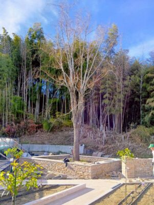 千年オリーブの森の拡張部分の一番奥に柳の木がある。。。そこの周囲を石積みして、ベンチを完成させた!ちょっとまたいでのベンチになるので、そこから柳を触っていただければ嬉しい!色々することが多く、視察できなかったが、出来栄えは抜群だった。